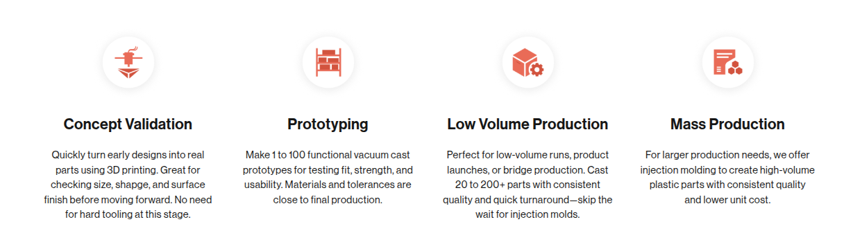 | Lead Time | Lead time varies based on part complexity and order volume. The full process includes prototype making, silicone mold creation, casting, and finishing. Simple single parts can ship in under 5 days, but larger batches may require more time depending on the project. |
