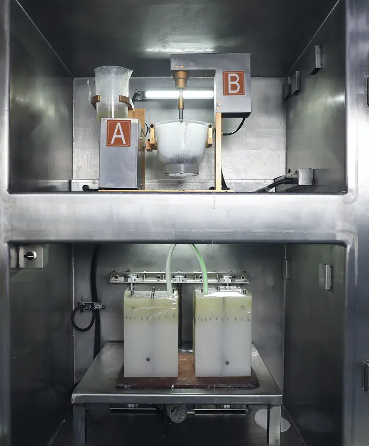 Mix liquid polyurethane resin and pour into molds under vacuum to prevent air bubbles and defects. Curing takes 30 minutes to 2 hours depending on material and size. One mold produces 1-10 copies daily. Cast urethane parts may require post-processing